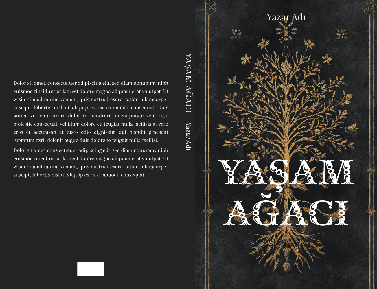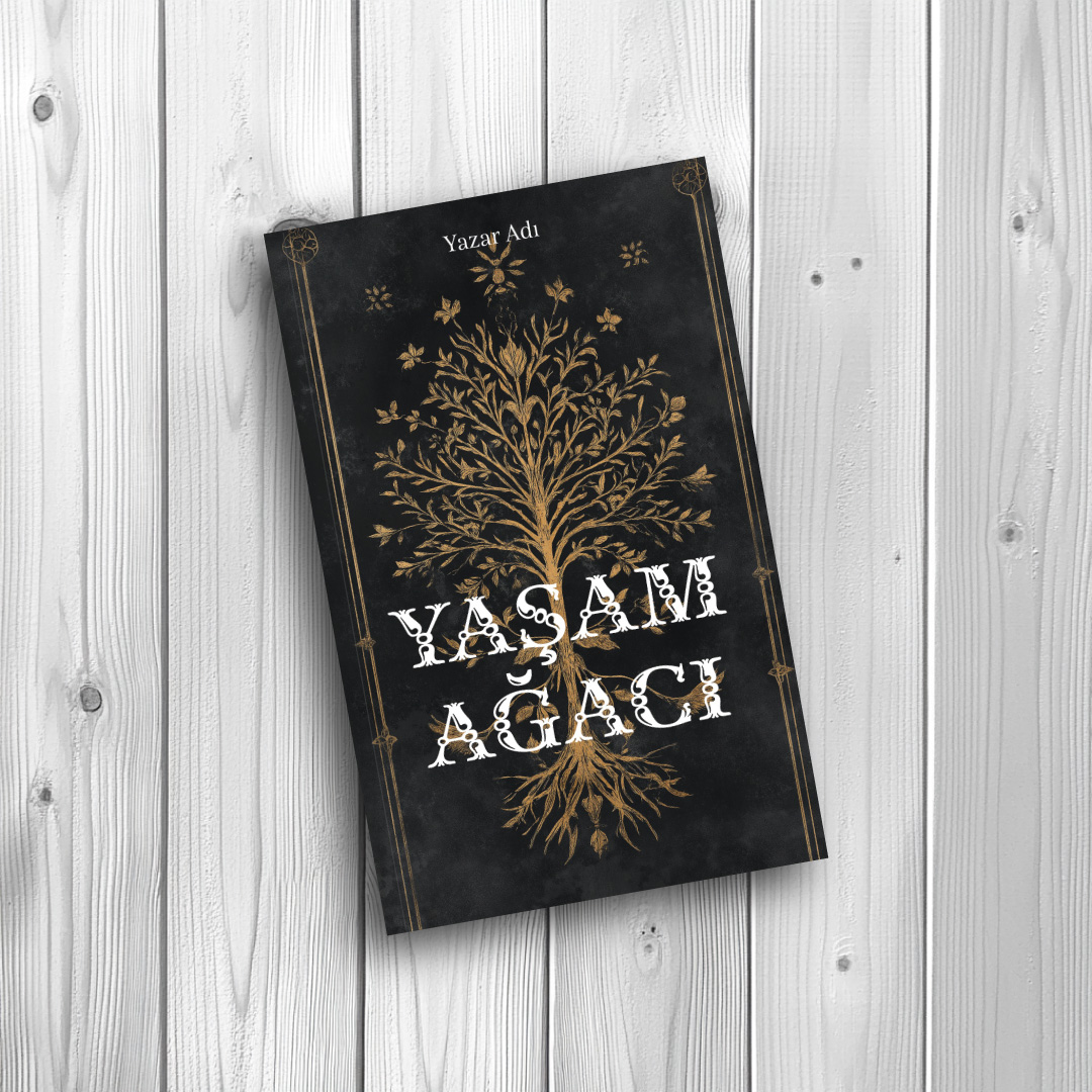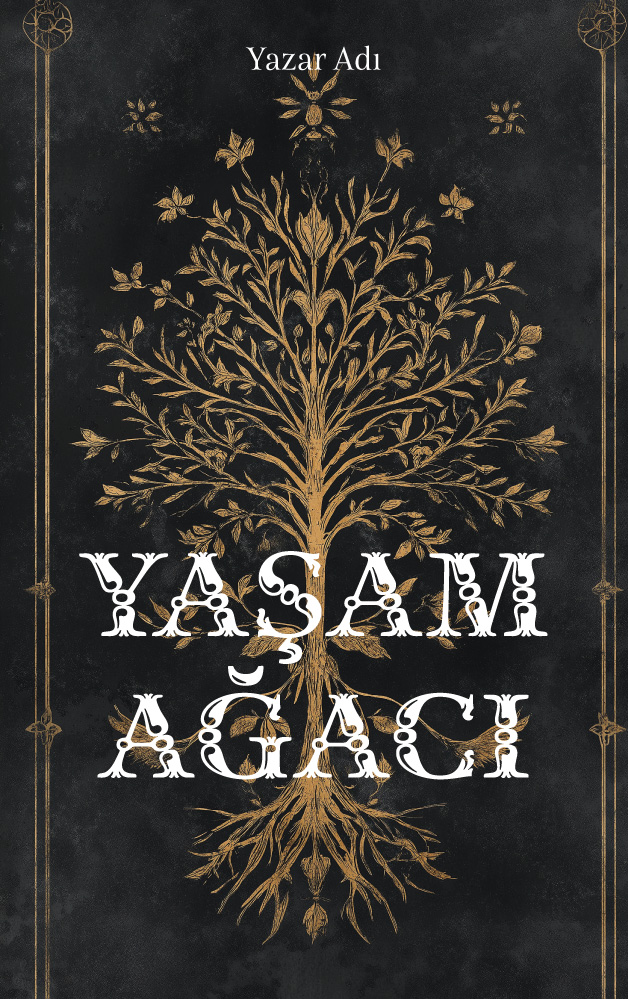 Koyu renkli, eskitilmiş dokulu bir arka plan üzerinde parlayan zarif ve simetrik altın sarısı ağaç illüstrasyonu, tasarıma antik ve mistik bir hava katıyor. Klasik işlemeleri andıran bu detaylı görsel; fantastik edebiyat, tarihi kurgu, gotik romanlar, mitoloji veya ezoterik felsefe türündeki eserler için kusursuz bir vitrin sunuyor. Kitabınıza hem lüks hem de gizemli bir kimlik kazandıracak şık bir tercih.