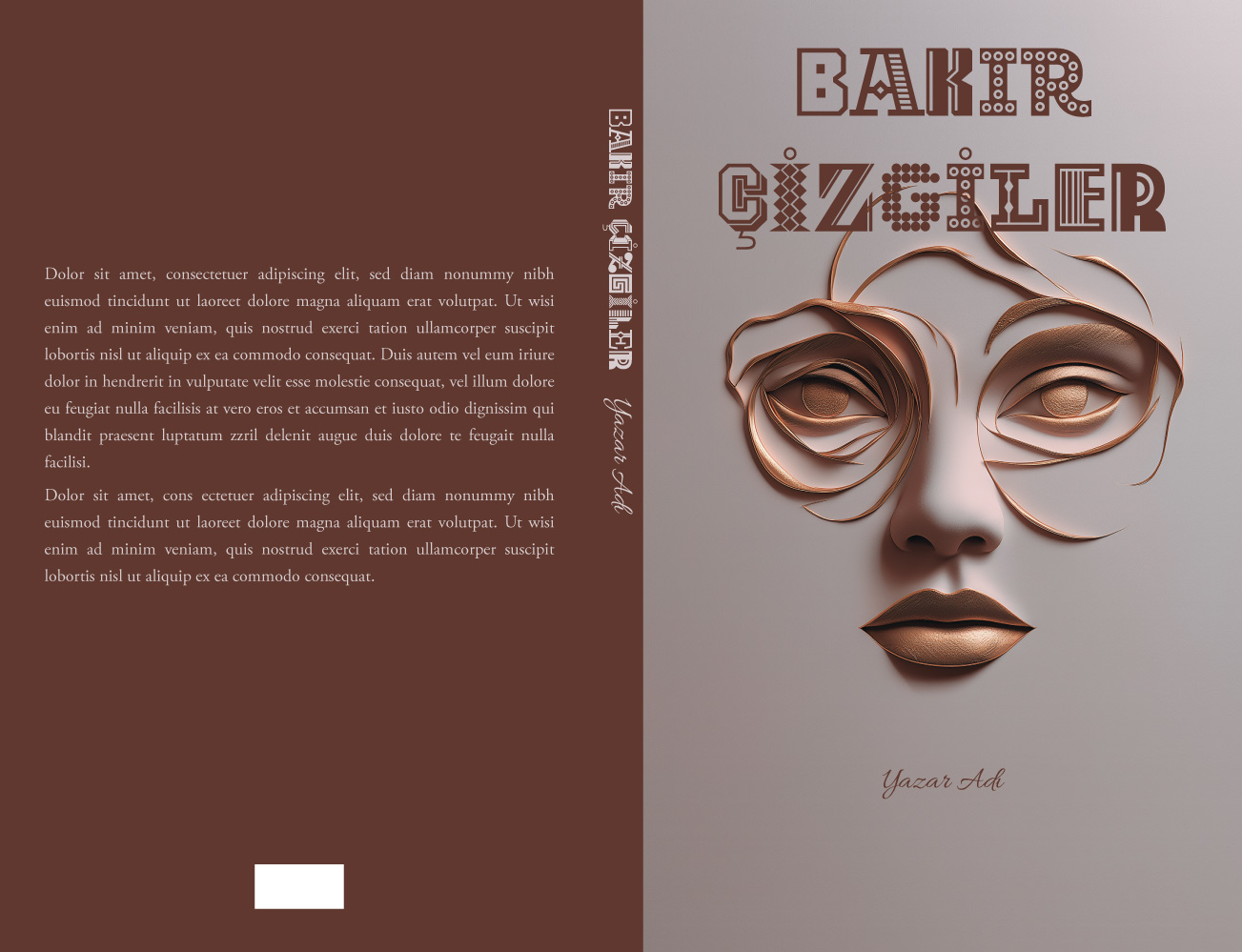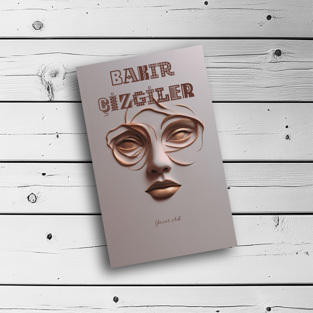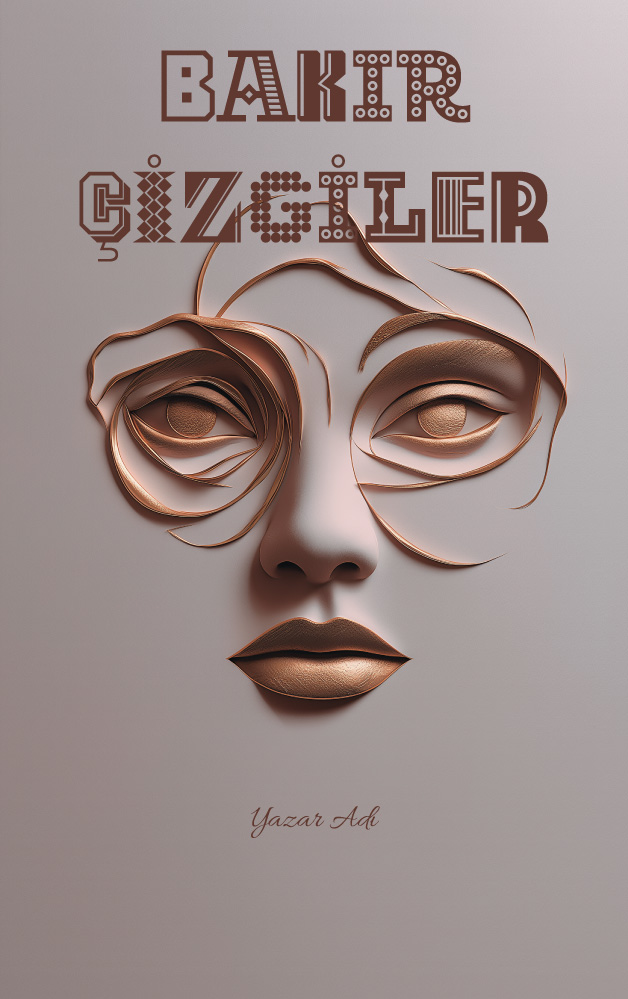 Üç boyutlu bakır rengi şeritlerin zarifçe kıvrılarak büyüleyici bir kadın yüzü oluşturduğu bu modern tasarım, lüks ve estetiği zirveye taşıyor. Pürüzsüz açık gri zemin üzerindeki bu rölyef etkili soyut portre; güzellik, kadın psikolojisi, modern edebiyat, sanat, moda veya biyografi kitapları için son derece şık ve yenilikçi bir duruş sergiliyor. Kitabınızın vitrinde bir sanat eseri gibi parlamasını sağlayacak eşsiz bir kapak.