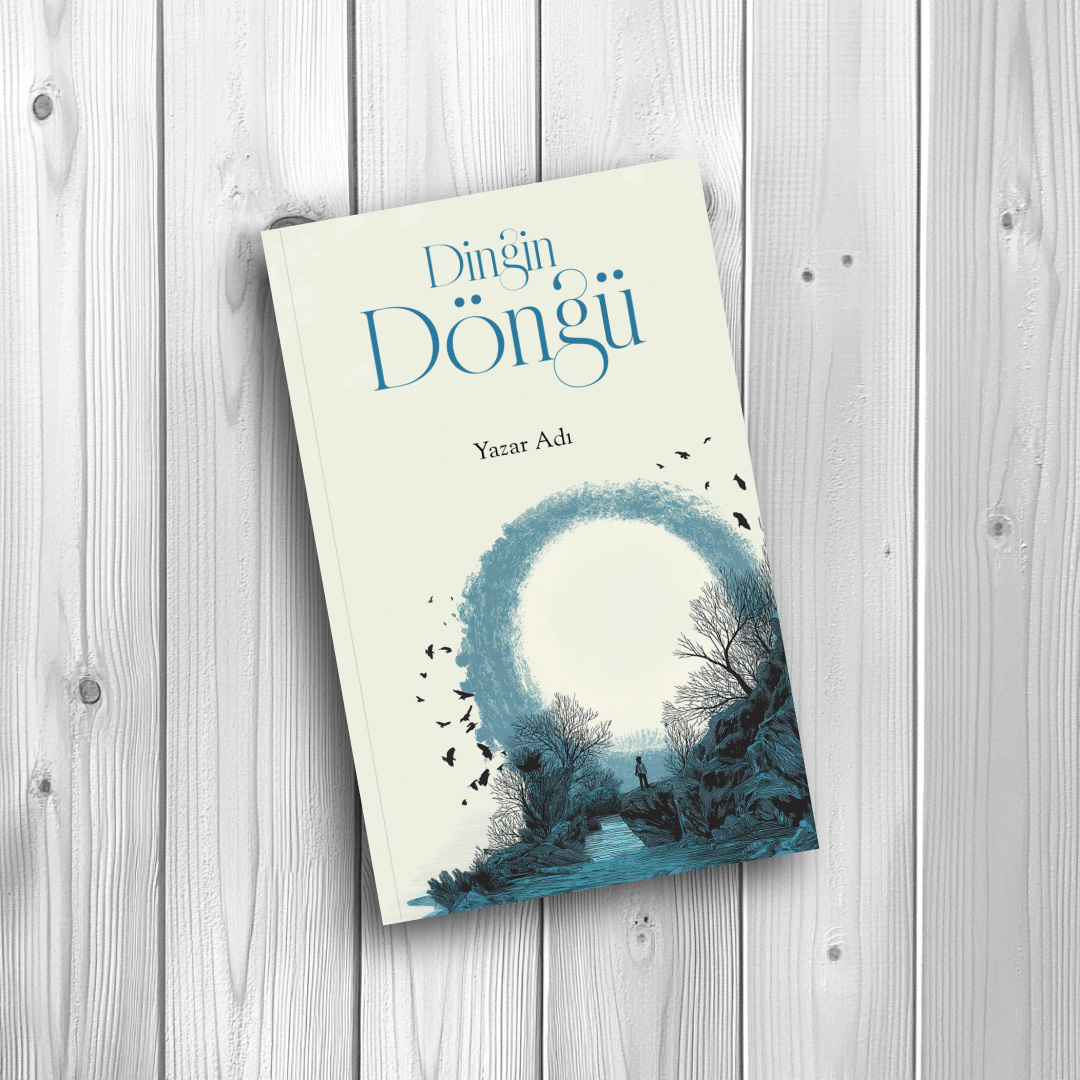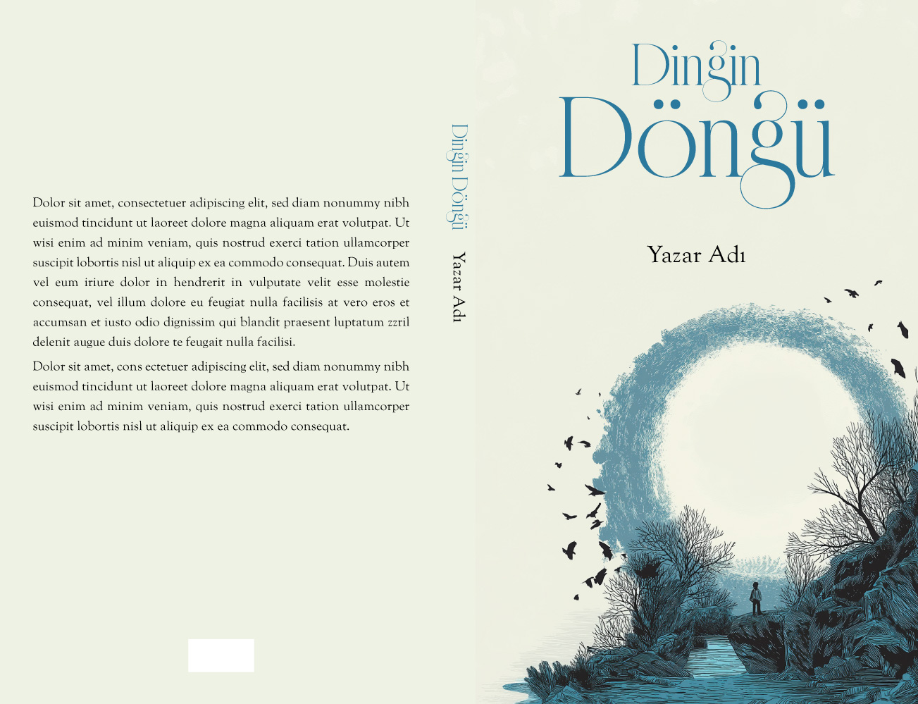 Ferah ve temiz bir arka plan üzerinde, fırça darbesini andıran mavi bir çemberin içinden süzülen kuşlar ve uçurum kenarındaki yalnız figür illüstrasyonu. Zen estetiği ve Uzak Doğu felsefesini andıran bu minimalist tasarım; içsel huzur, doğa, döngü, arayış ve yalnızlık temalarını işliyor. Şiir, felsefe, modern edebiyat, deneme veya kişisel gelişim kitapları için okuyucuya sakinlik ve derinlik vadeden oldukça sanatsal bir kitap kapağıdır.