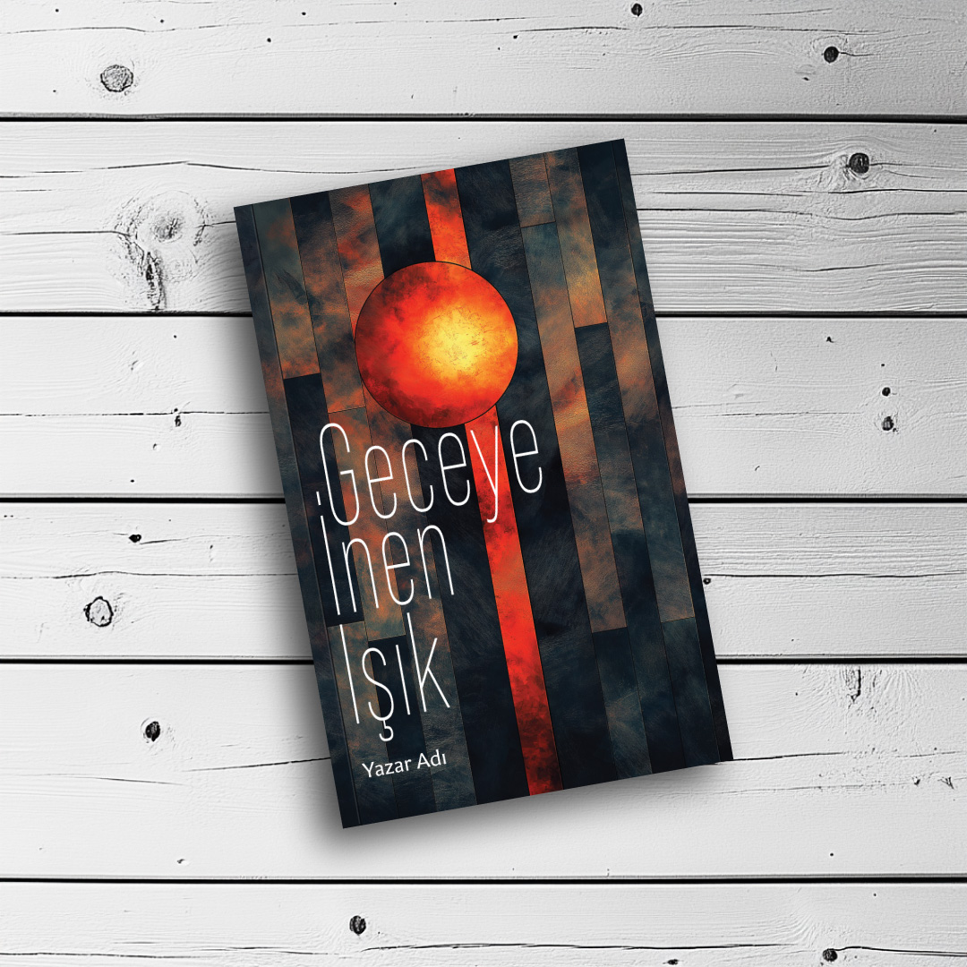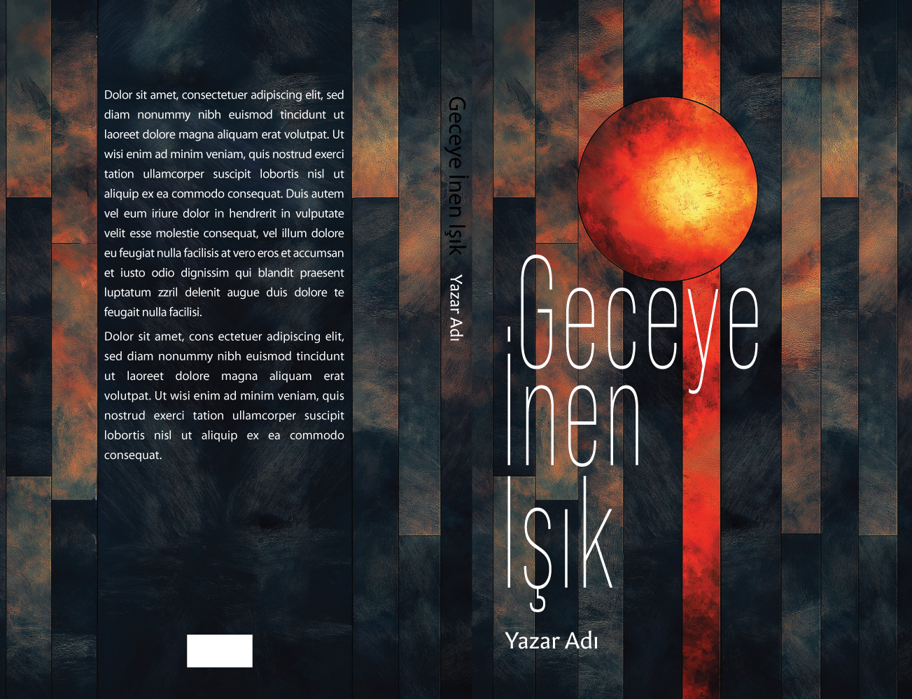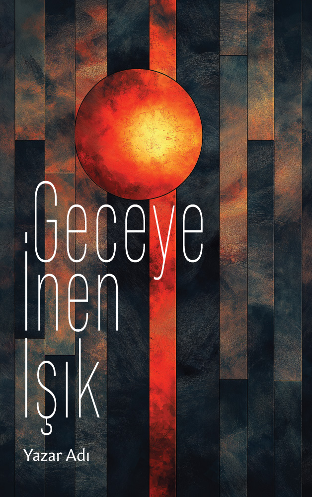 Gece mavisi ve koyu gri dikey panellerin arasında parlayan devasa bir kırmızı/turuncu güneşin ve ondan aşağıya süzülen parlak bir ışık sütununun yer aldığı bu mimari ve soyut kapak tasarımı, güçlü bir atmosfer sunuyor. Zıtlıkların uyumuyla yaratılan bu derinlik hissi; bilim kurgu, distopya, gerilim, polisiye veya fütüristik kurgular için biçilmiş kaftandır. Okuyucuda anında merak uyandıran bu geometrik ve modern görsel, kitabınızın taşıdığı gizemi ve karanlık atmosferi en çarpıcı şekilde yansıtmanıza yardımcı olacaktır.