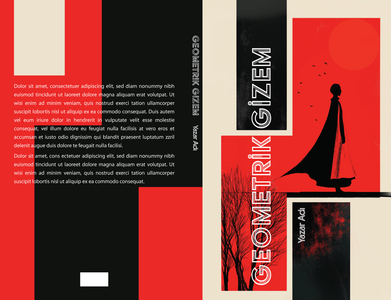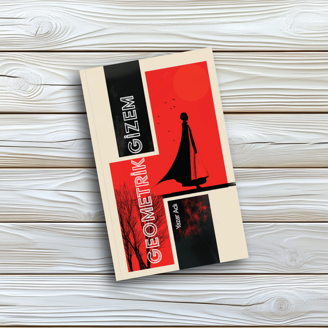 Siyah, kırmızı ve krem renklerinin cesurca kullanıldığı geometrik panellerden oluşan bu tasarım, avangart ve modern bir gerilim atmosferi sunuyor. Kızıl gökyüzü altındaki yalnız yürüyen pelerinli figür, uçan kuşlar ve kuru ağaç dalları, bu minimalist kompozisyona hareket ve hikaye katıyor. Polisiye, gizem, modern edebiyat, gotik veya distopya türündeki kurgularınız için vitrinde oldukça şık, profesyonel ve iddialı duracak bir görseldir.