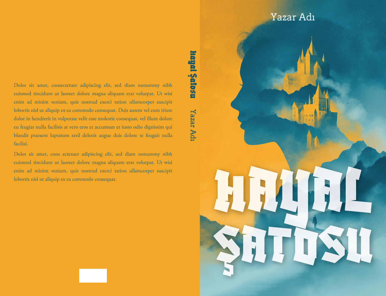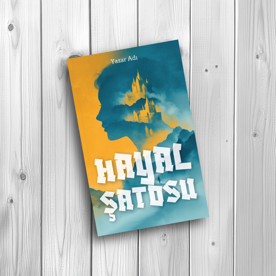 Mavi ve sıcak turuncu tonlarının çarpıcı uyumuyla oluşturulmuş bu sanatsal çift pozlama (double exposure) tasarımı, bir kadın silüetinin içine yerleştirilmiş masalsı bir şato ve dağ manzarası sunuyor. Modern edebiyat, fantastik kurgu, masallar veya içsel yolculuğu anlatan eserler için okuyucuyu anında büyüleyecek, estetik ve derinlikli bir hazır kitap kapağıdır.