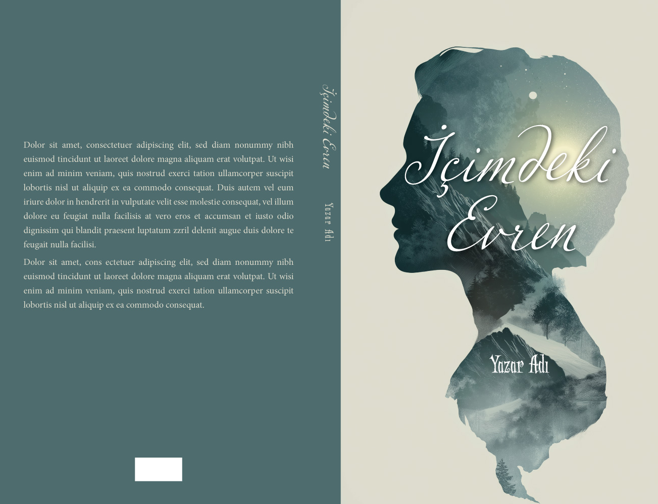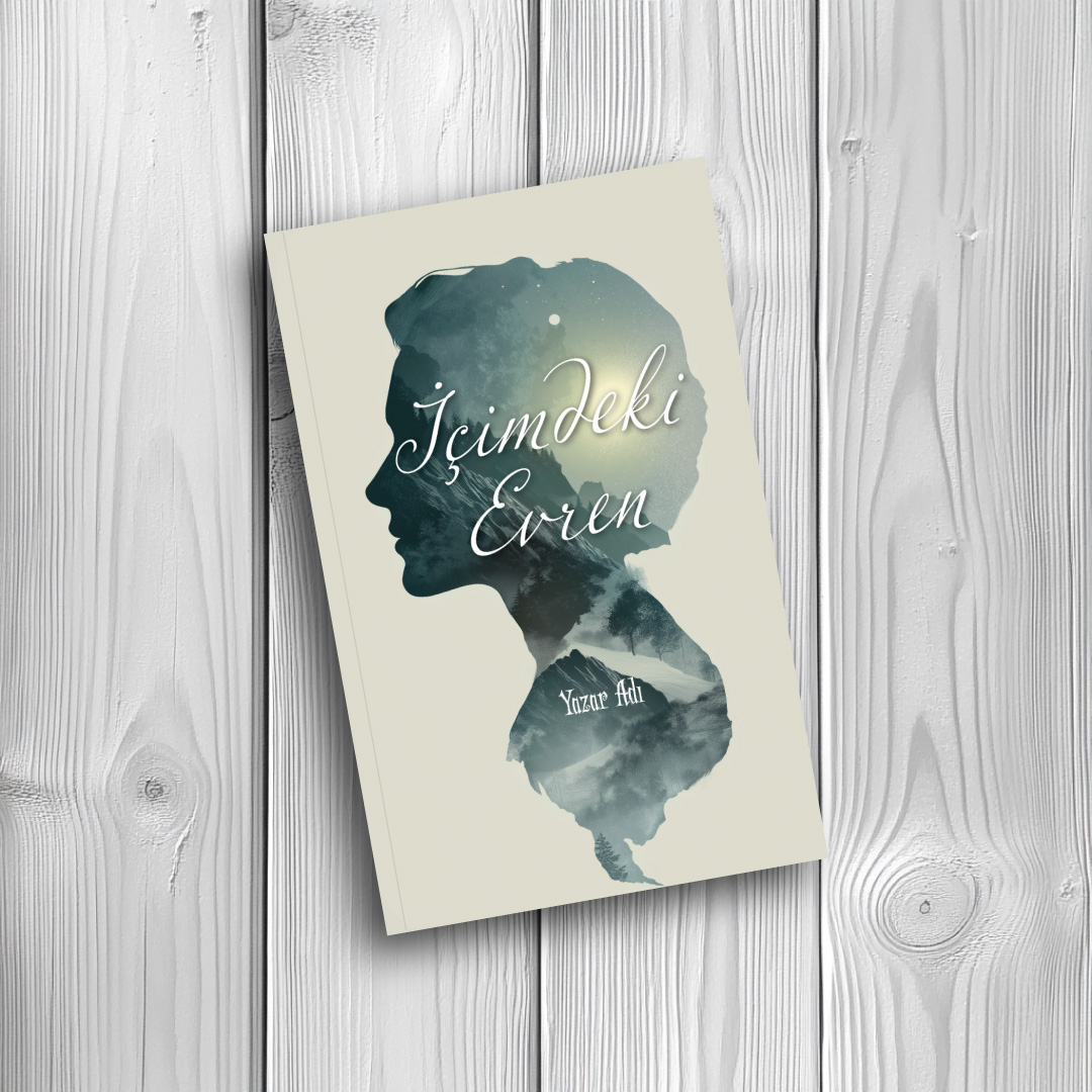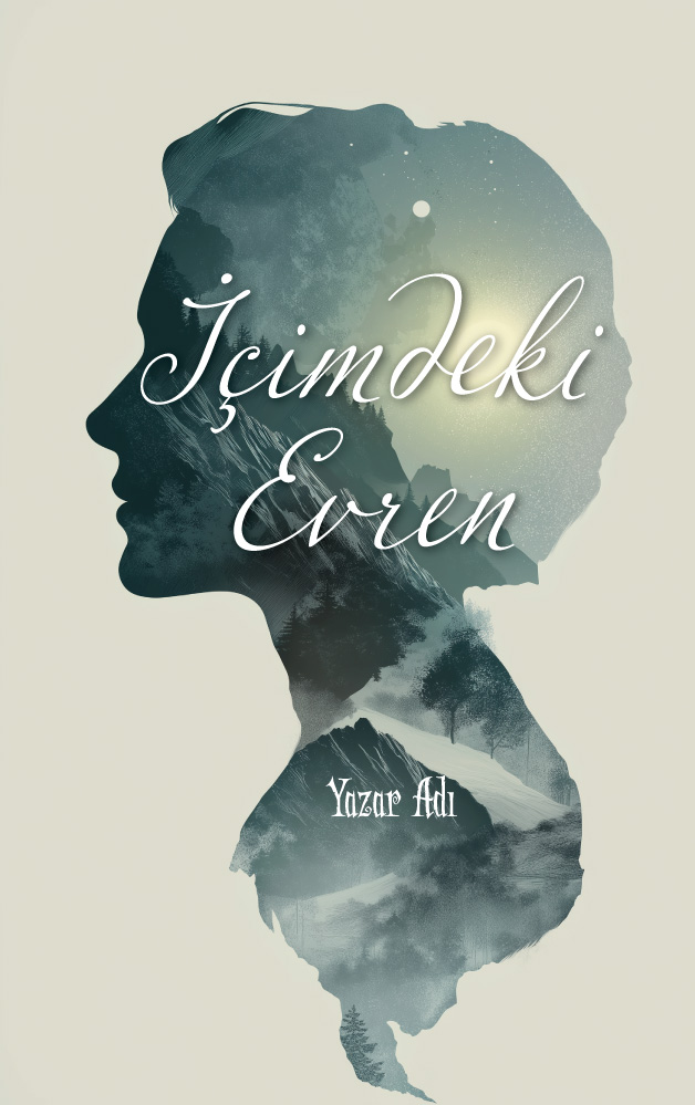 Çift pozlama (double exposure) tekniğinin kusursuz bir örneği olan bu sanatsal kitap kapağı, zarif bir insan profilinin içine büyüleyici bir kış manzarası yerleştiriyor. Sisli dağlar, çam ormanları, parlak bir güneş ve yıldızlı gökyüzü, insanın iç dünyasının ne kadar geniş ve keşfedilmeyi bekleyen bir doğa olduğunu simgeliyor. Kişisel gelişim, doğa yazıları, anı, psikoloji, modern edebiyat, şiir veya biyografi kitapları için okuyucuya derin bir huzur ve estetik sunan, oldukça şık ve modern bir tasarımdır.