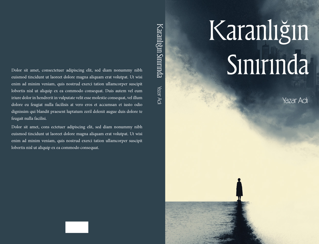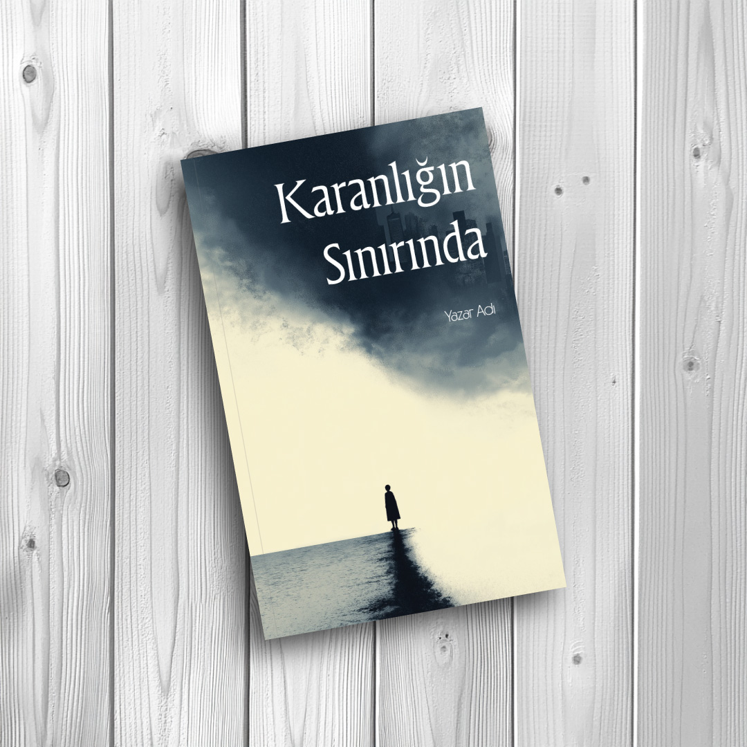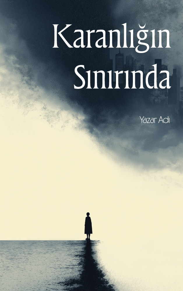 Zıtlıkların çarpıcı bir şekilde sunulduğu bu tekinsiz hazır kitap kapağı tasarımı, aydınlık bir boşluğun ortasında duran yalnız bir figürü ve gökyüzünü kaplayan devasa, karanlık bir fırtına bulutunun içinden beliren baş aşağı bir şehir silüetini resmediyor. İki farklı dünya, paralel evrenler, distopya, korku, gerilim veya psikolojik kurgular için mükemmel bir gerilim atmosferi yaratıyor. Okuyucuyu anında bilinmezliğin içine çeken, sarsıcı ve sinematik bir görsel şölen.