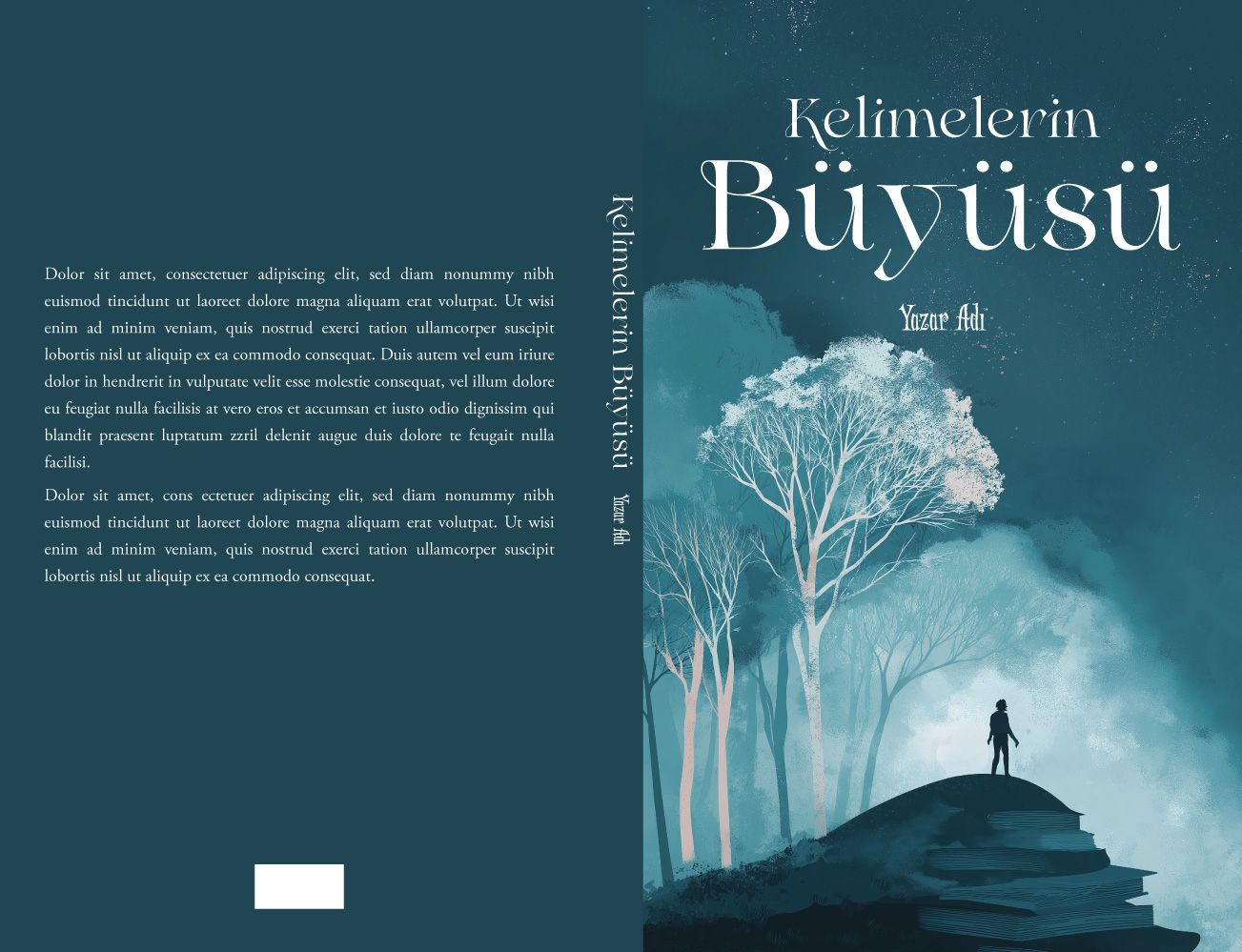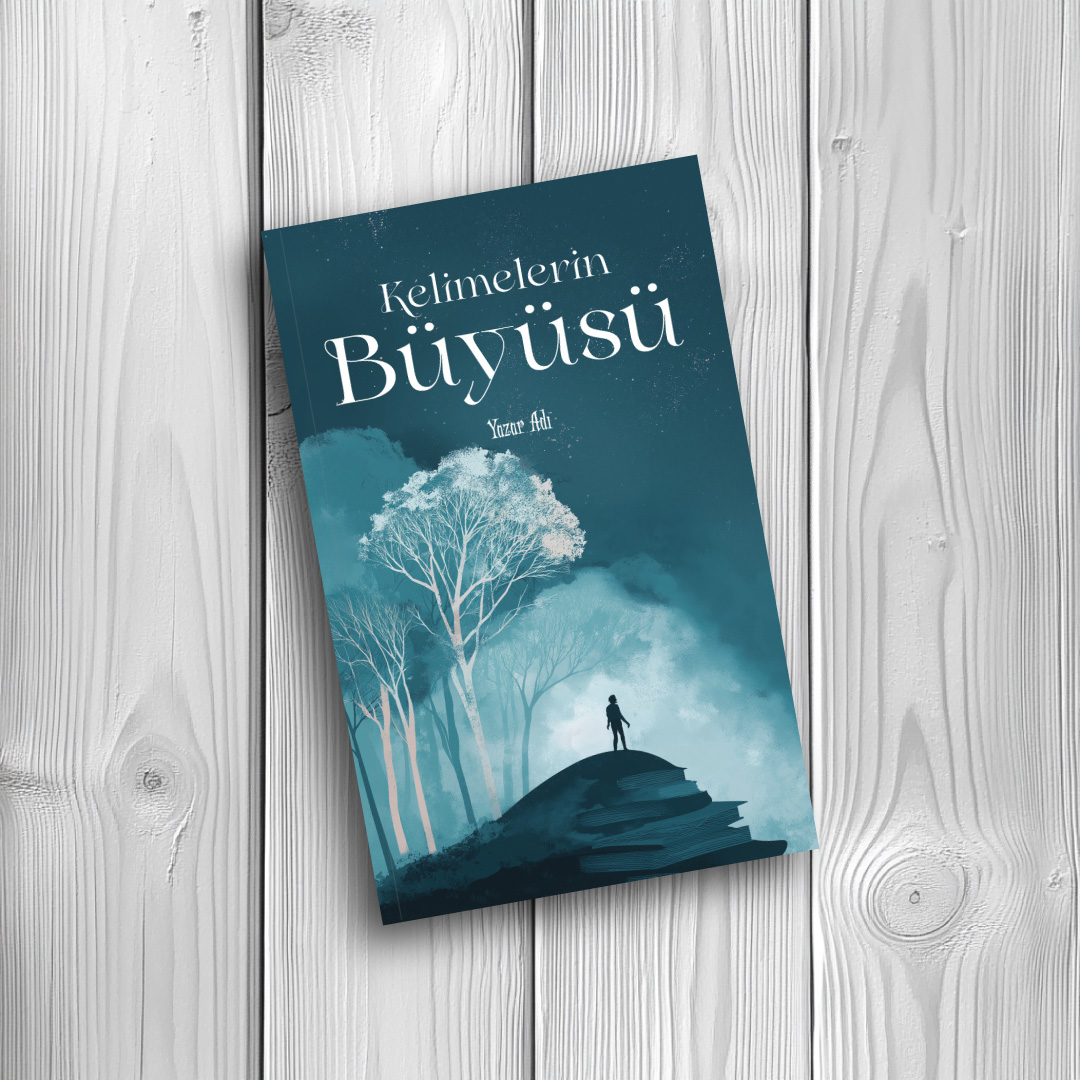 Gece mavisi ve camgöbeği tonlarının büyüleyici uyumuyla tasarlanmış bu fantastik kapak, üst üste dizilmiş devasa kitaplardan oluşan bir tepede duran figürü ve ardındaki parlayan rüya gibi ormanı merkezine alıyor. Gökyüzündeki yıldızlar tasarıma masalsı bir atmosfer katıyor. Okuma tutkusu, hayal gücü, fantastik dünyalar ve macera temalarını işleyen bu görsel; fantastik edebiyat, genç yetişkin romanları, masallar veya büyülü gerçekçilik eserleri için kusursuz bir seçimdir.