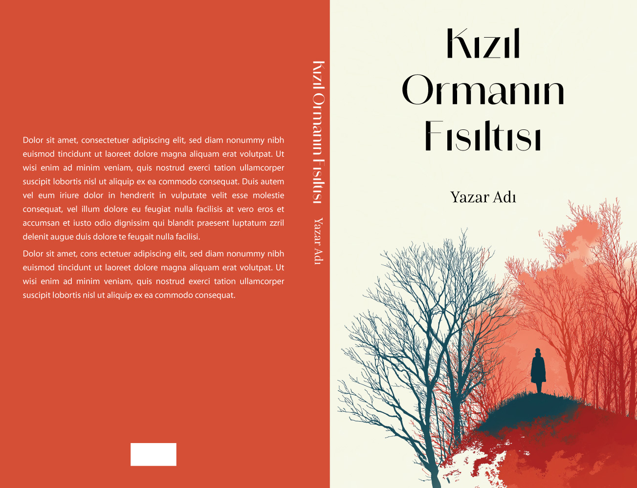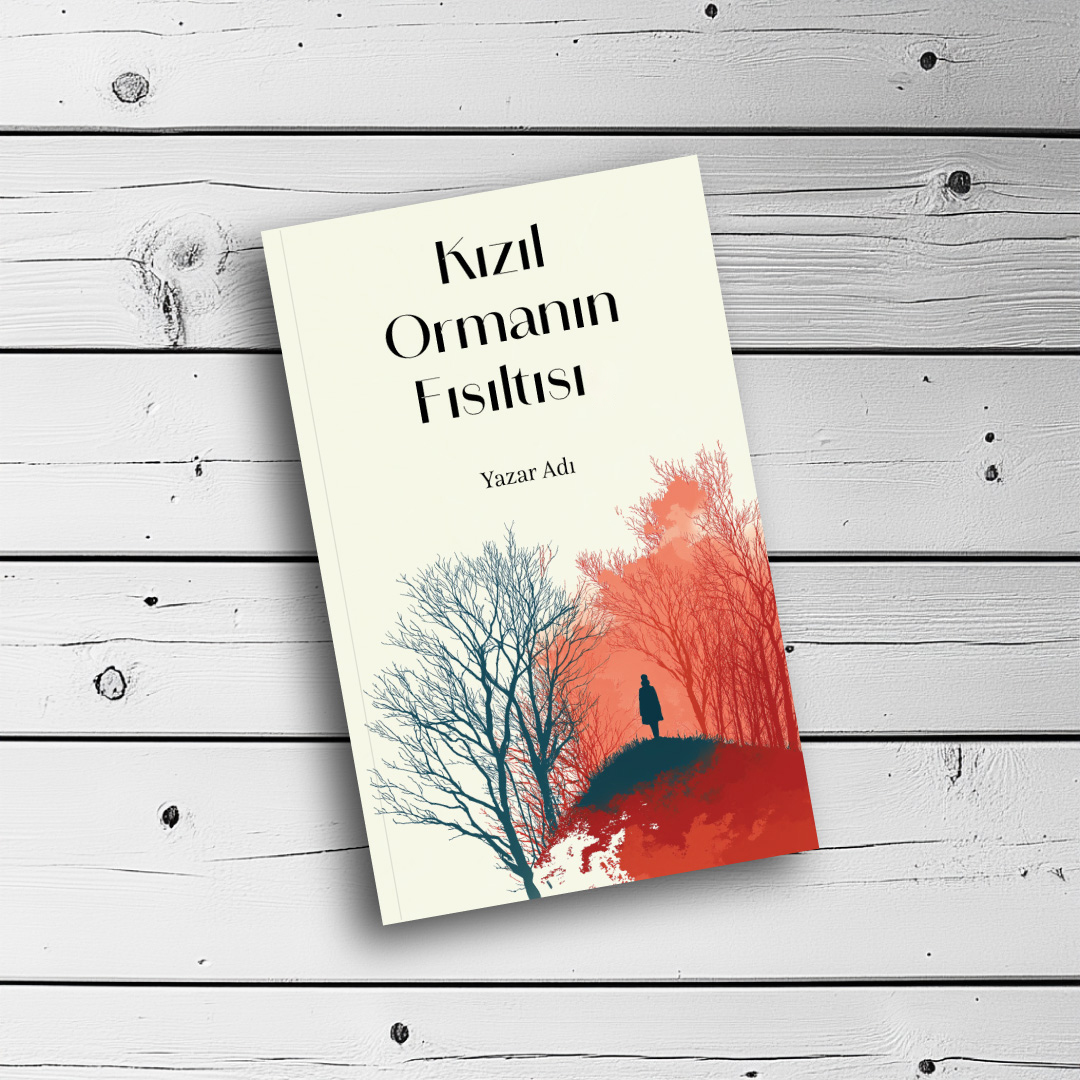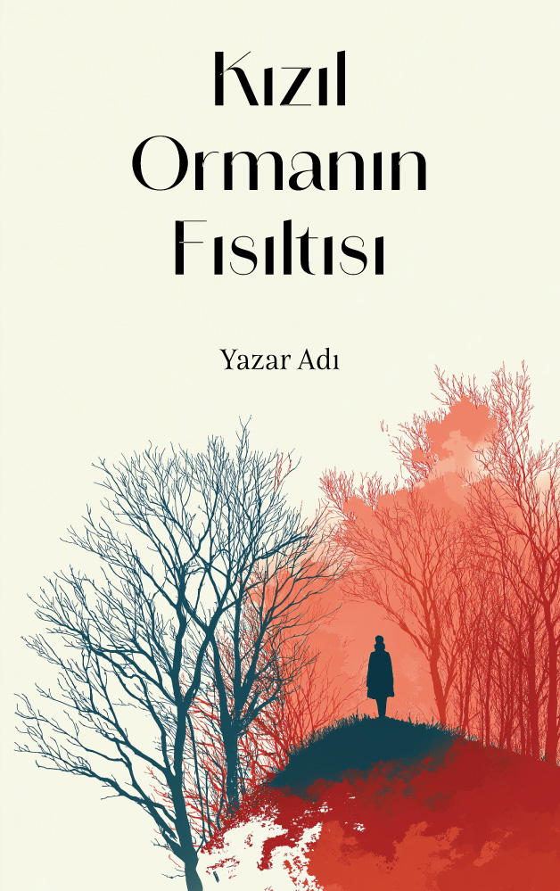 Krem rengi ferah bir arka plan üzerinde, soğuk lacivert ve canlı kızıl tonlarındaki ağaçların oluşturduğu çarpıcı kontrastı merkezine alan bu tasarım, doğanın ve duyguların zıtlığını vurguluyor. Tepede duran yalnız figür, kompozisyona derin bir melankoli ve içsel arayış katıyor. Şiir, modern edebiyat, deneme, doğa yazıları veya psikolojik dönüşüm temalı kitaplar için son derece sanatsal, renkli ve estetik bir zemin oluşturuyor.