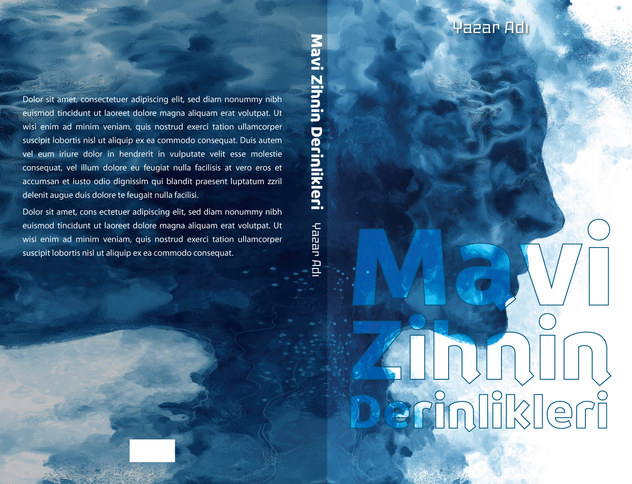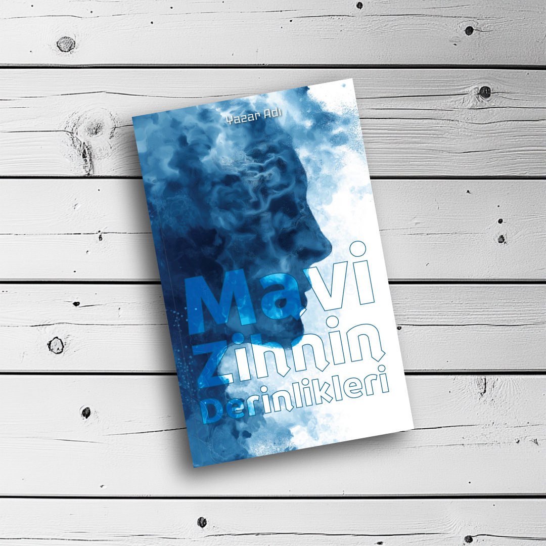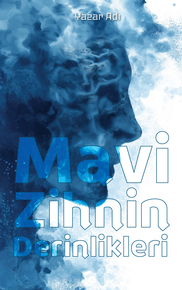 Derin mavi tonlarında su ve mürekkep dağılımlarını andıran dokularla oluşturulmuş bu çarpıcı profil illüstrasyonu, insan zihninin karmaşıklığını ve akışkanlığını temsil ediyor. Çift pozlama hissi veren bu soyut tasarım; psikoloji, felsefe, kişisel gelişim, dram veya derin modern edebi kurgular için mükemmel bir uyum sağlıyor. Okuyucuya içsel bir yolculuk vadeden oldukça lüks ve modern bir görsel.