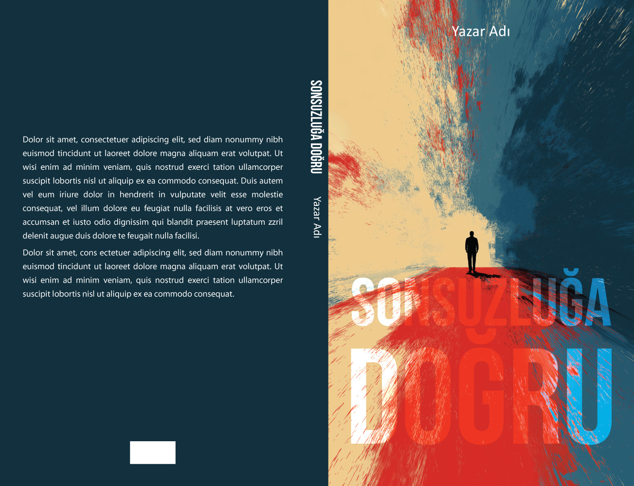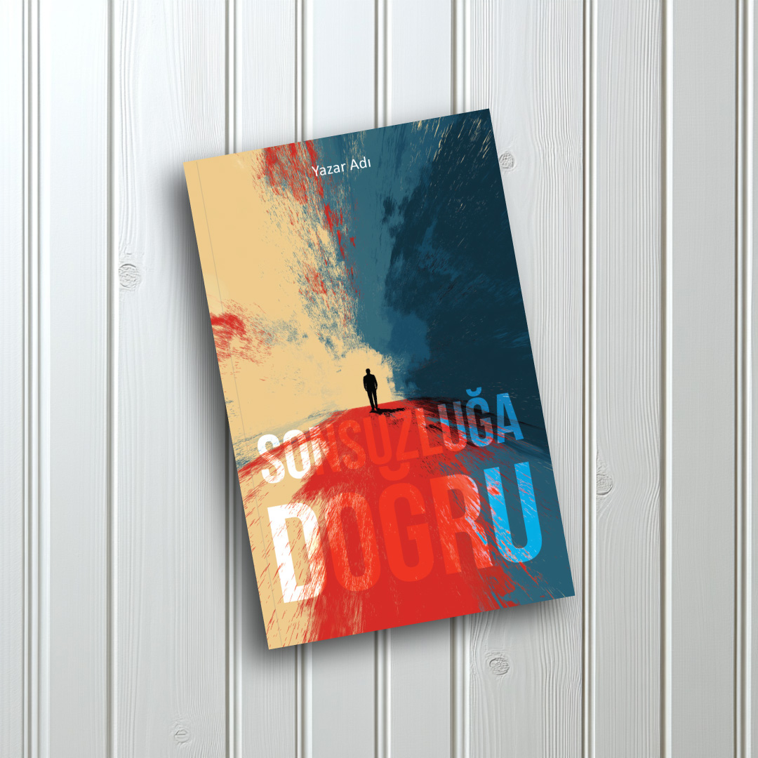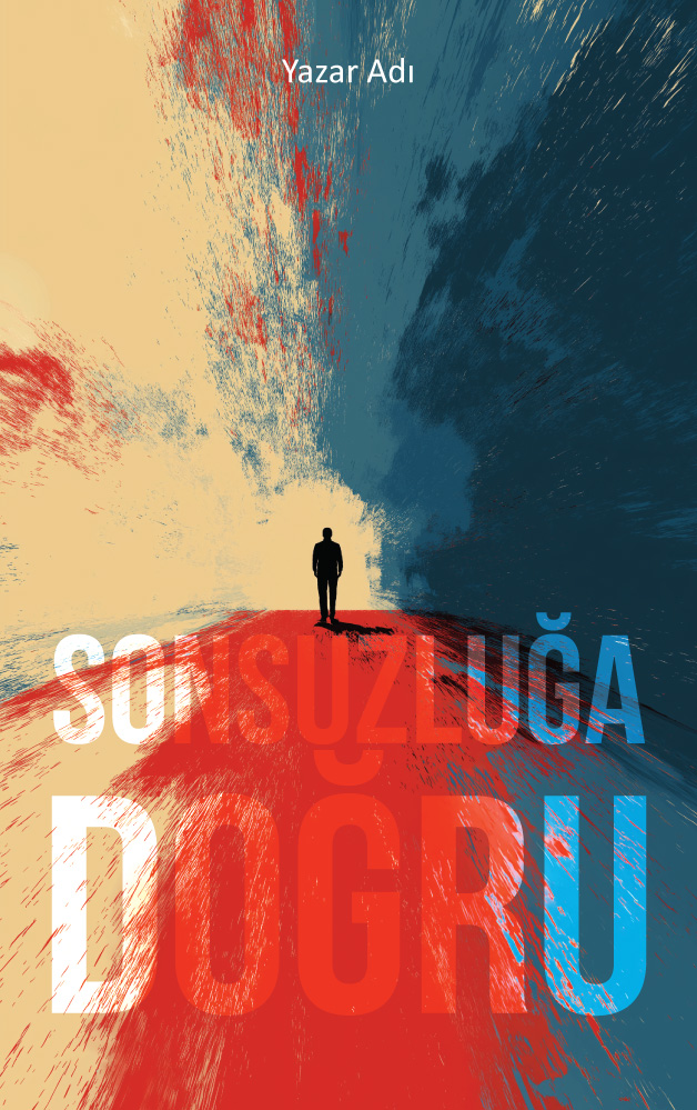 Derin mavi ve sıcak sarı tonlarının dramatik fırça darbeleriyle ikiye ayrıldığı gökyüzünün altında, kan kırmızısı bir yolun sonunda duran yalnız bir figürü merkezine alan bu tasarım, yolculuk ve karar anı temalarını işliyor. Güçlü kontrastı ve minimalist dokusuyla kişisel gelişim, felsefe, modern edebiyat, biyografi ve distopik türdeki eserler için çarpıcı, iddialı ve sanatsal bir kapak seçeneğidir.
