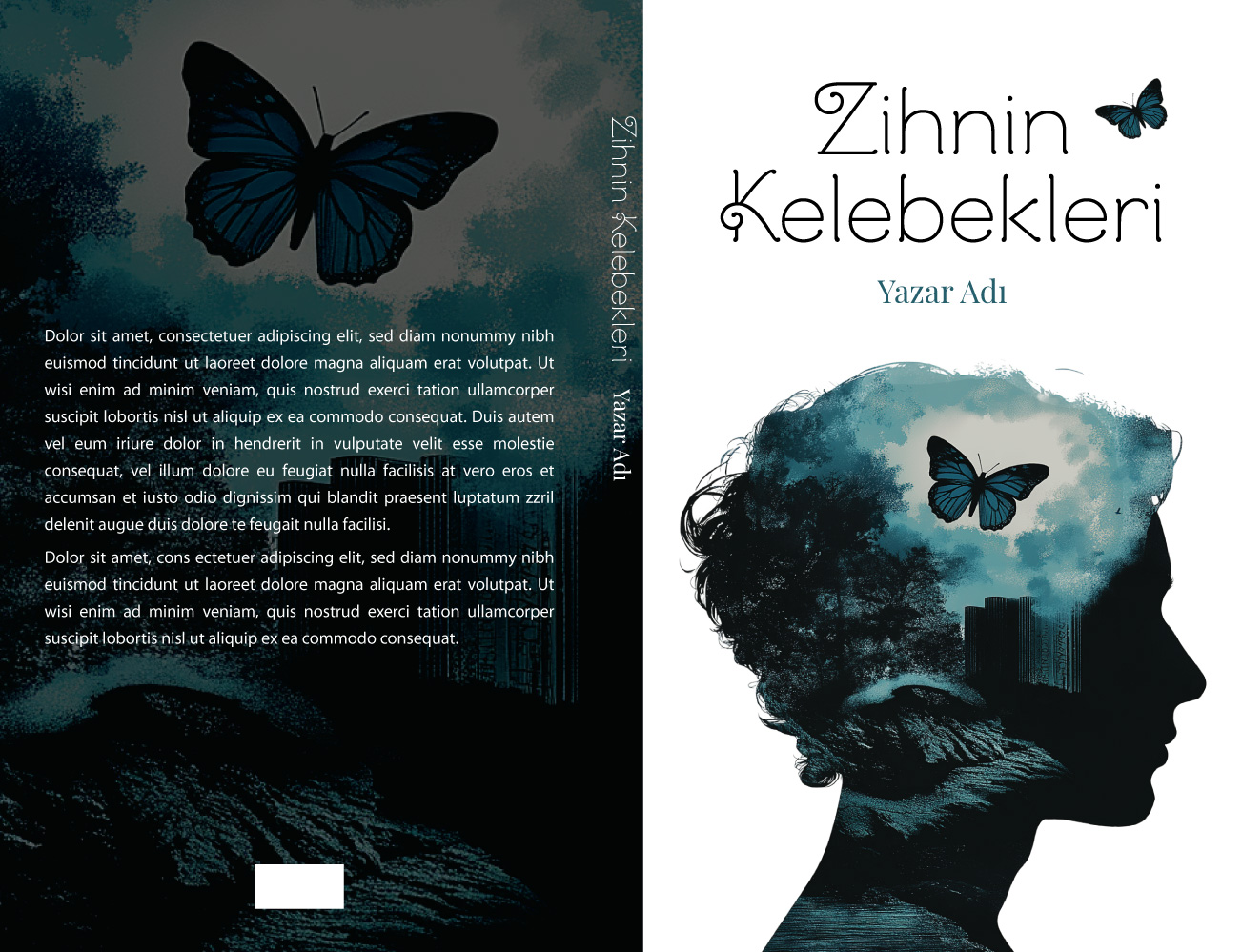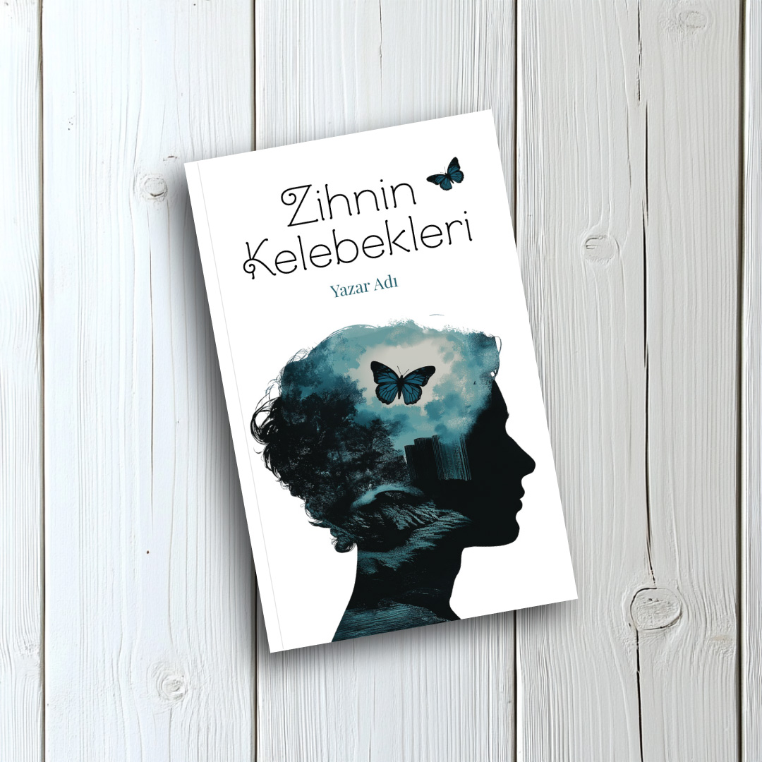 Çift pozlama (double exposure) tekniğinin büyüleyici bir örneği olan bu tasarım, bir insan profilinin içinden gökyüzüne doğru uçan mavi kelebekleri resmediyor. Silüetin içindeki ağaçlar ve bulutlar, insanın iç dünyasının zenginliğini ve özgürlük arayışını sembolize ediyor. Psikoloji, kişisel gelişim, şiir, modern edebiyat ve felsefi eserler için okuyucuya umut ve ferahlık vadeden, oldukça sanatsal ve estetik bir kitap kapağıdır.